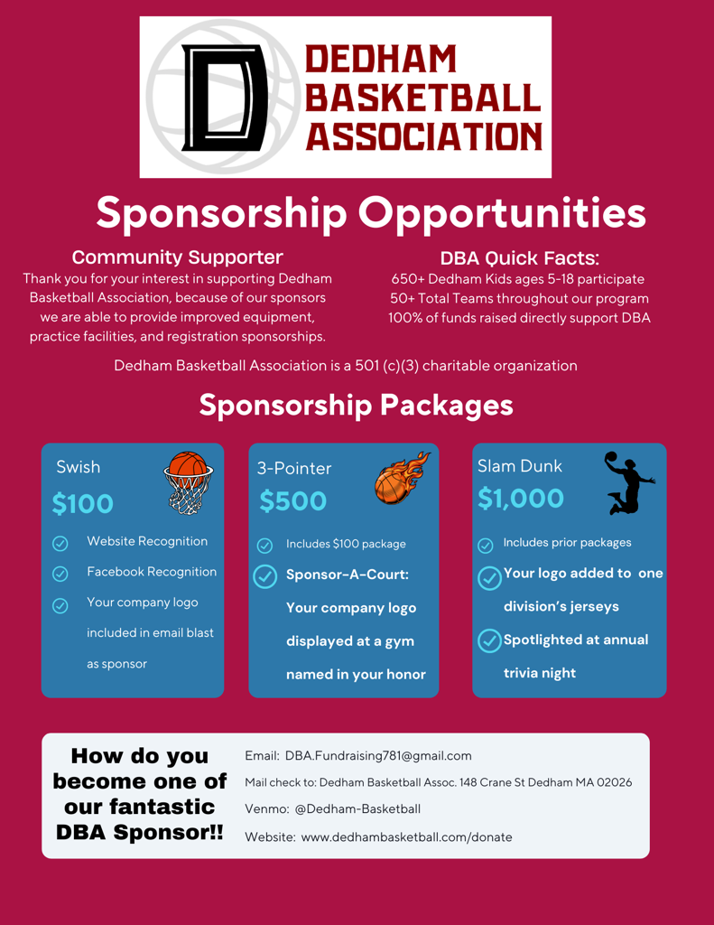 Dedham Basketball Association (DBA) is a registered non-profit corporation and is completely supported by volunteers.
